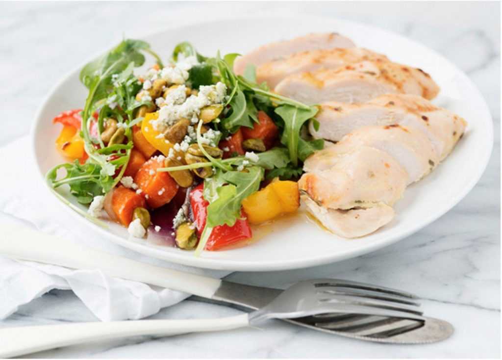 - Запеченная куриная грудка с овощами гриль.
