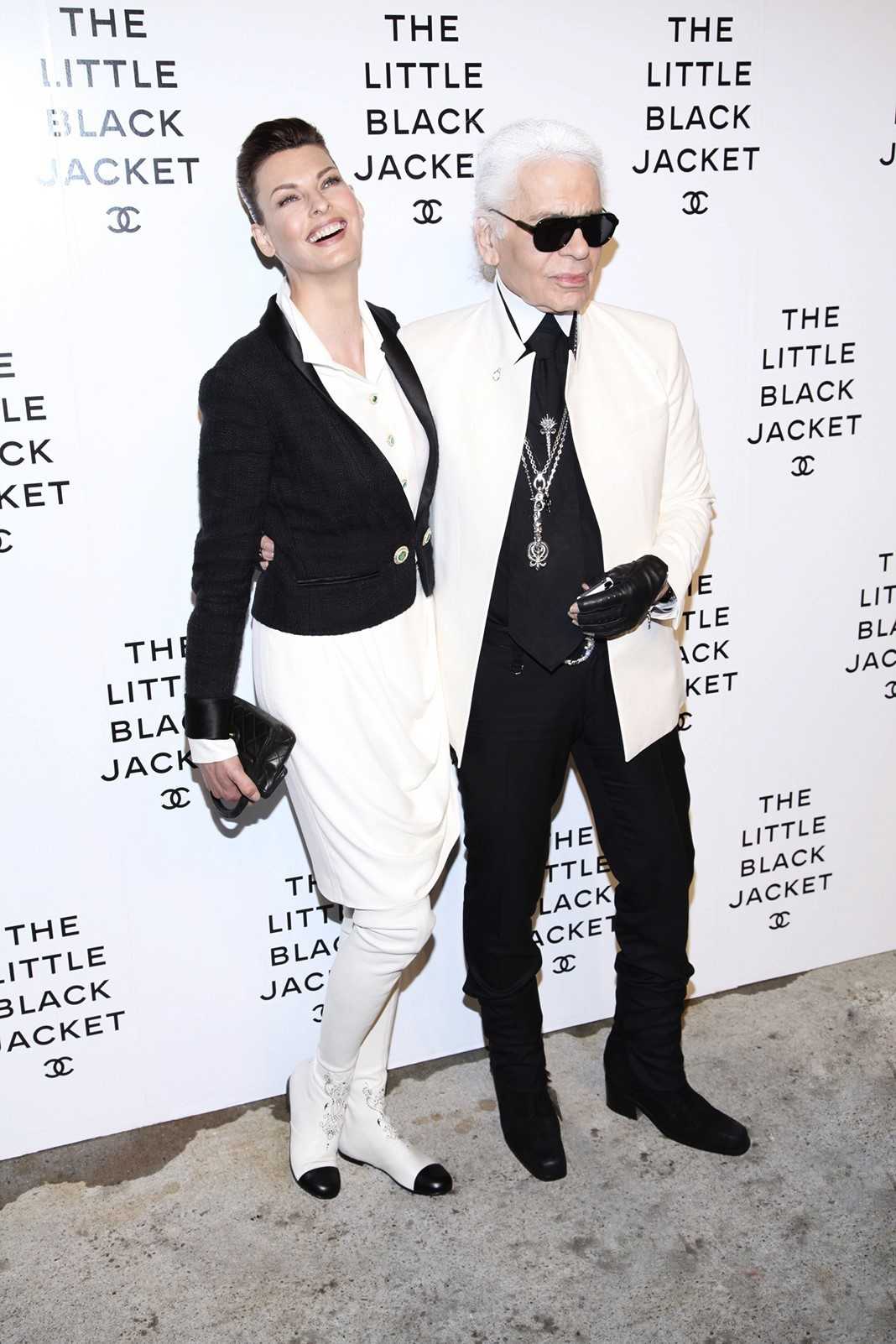 Модель и Карл Лагерфельд на открытии выставки Chanel: The Little Black Jacket в Нью-Йорке, 6 июня 2012 г.
