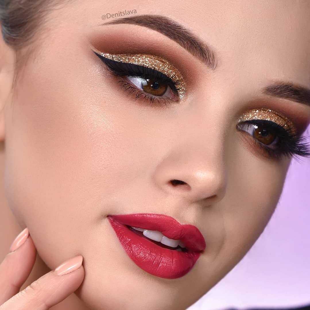- Среди бьюти-трендов находится и галочка над верхней губой. Чтобы ее сделать, достаточно покрасить губы в любой понравившийся вам оттенок: розовый, винный, бордовый и т.д. При помощи контрастного лайнера для век нанесите импровизированную галочку над верхней губой. Золотые и серебряные глиттеры снова на пике популярности в новом сезоне.
